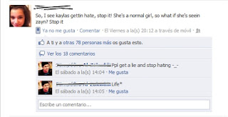 Lo hemos traducido y significaría "Bueno, estoy viendo que Kayla está obteniendo odio, ¡basta! Es una chica normal, ¿qué pasa si ve con Zayn? ¡Basta!"